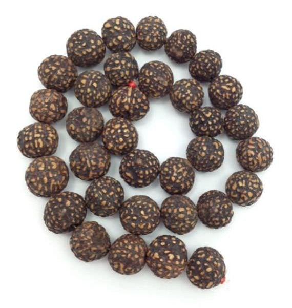 Ein Strang schwarze Thatch Samenperlen mit Antiklook. Jede Perle ist ca. 14mm groß. Thatch Samenperlen sind rund und braun durchzogen von vielen schwarzen Linien, die den Perlen den Antiklook geben. Der Strang ist ca. 40cm lang und besteht aus ca. 30 Perlen. Das Schnurloch hat einen Durchmesser von ca. 1,5mm.