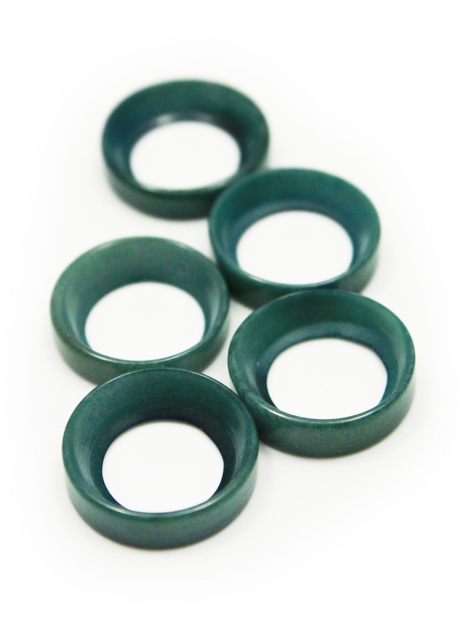 Fünf breite grüne Ringe mit unterschiedlich großen Löchern auf beiden Seiten, ca. 15mm groß.