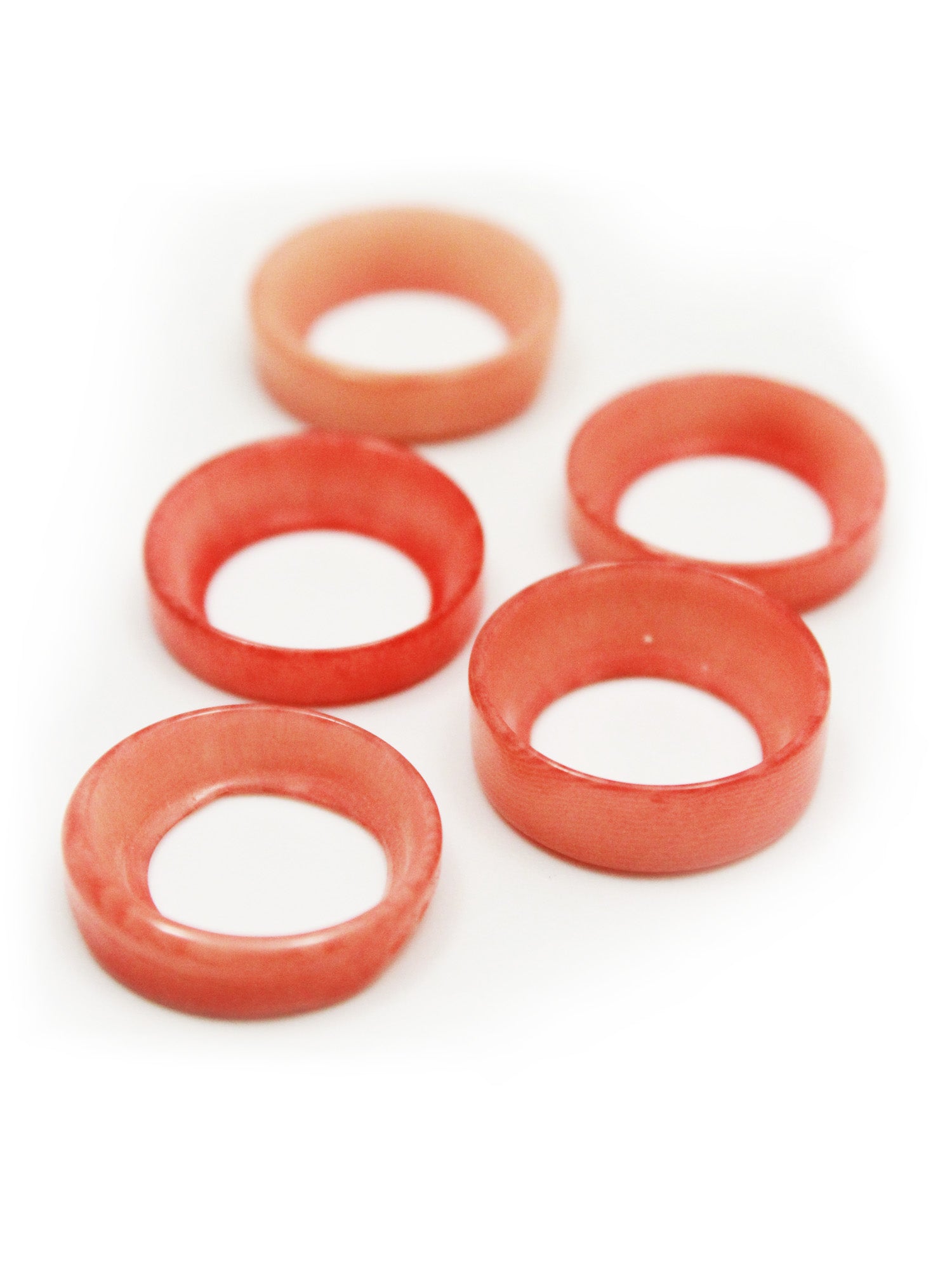 Fünf breite Ringe in lachsrosa mit unterschiedlich großen Löchern auf beiden Seiten, ca. 15mm groß.