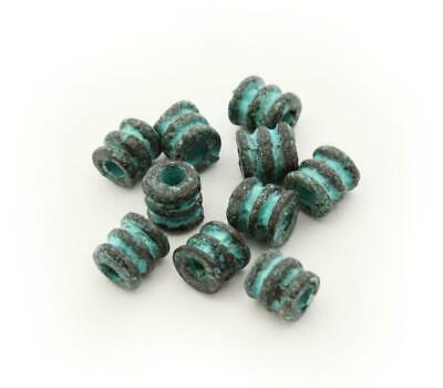 Zehn kleine tubenförmige Zamacperlen mit grüner Patina, 4-5mm lang.