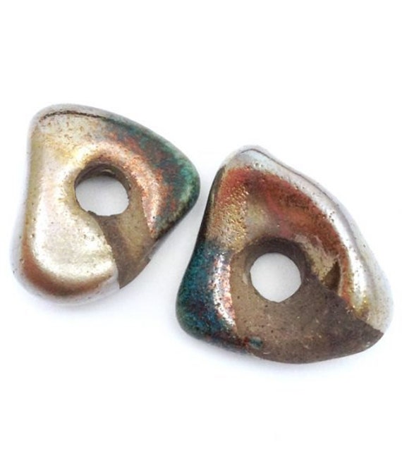 Two green-silver-golden Raku ceramic triangles, 18mm in size, with a large hole.