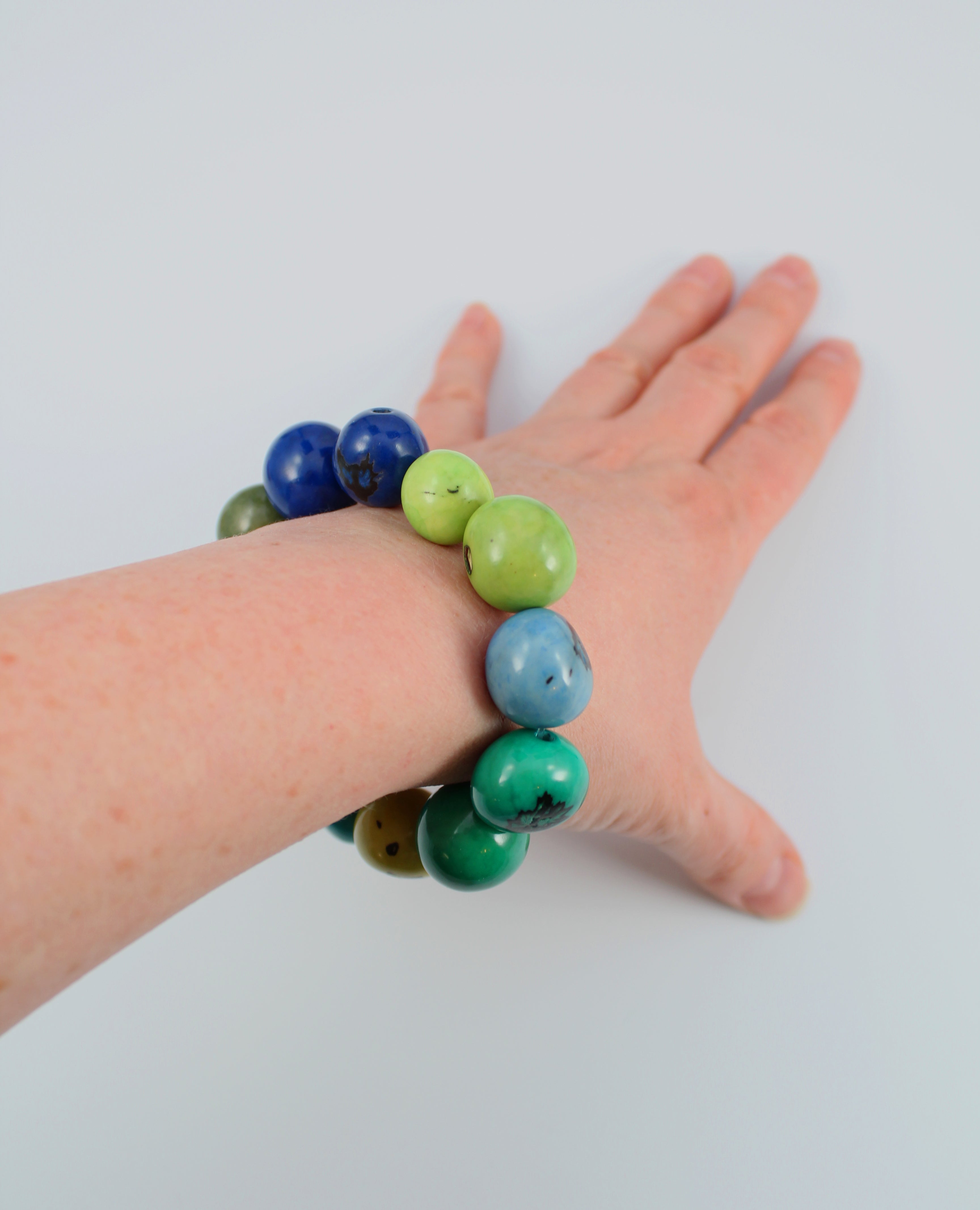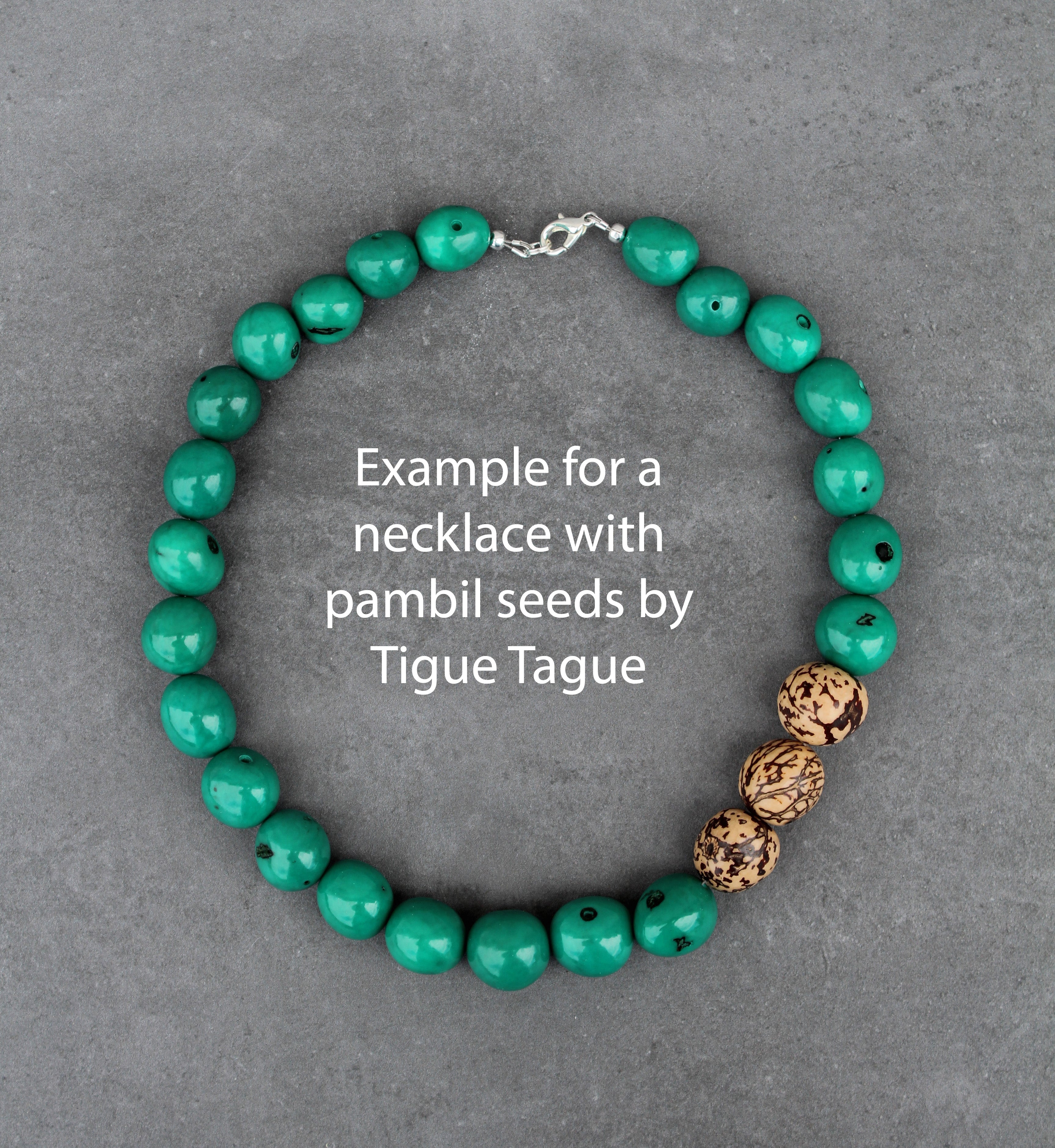 Uncolored Pambil seeds are ivory colored. Depending on the weather, the seeds can sometimes be a little darker, which then influences the final color. Green then turns into dark green.