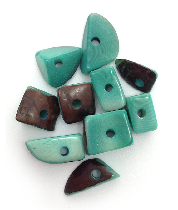 Ten medium sized aqua colored tagua triangles, approximately 15mm in size.
