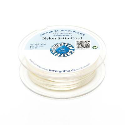 Five meters of cream colored nylon satin ribbon on a spool. The nylon cord is 1.0mm thick.