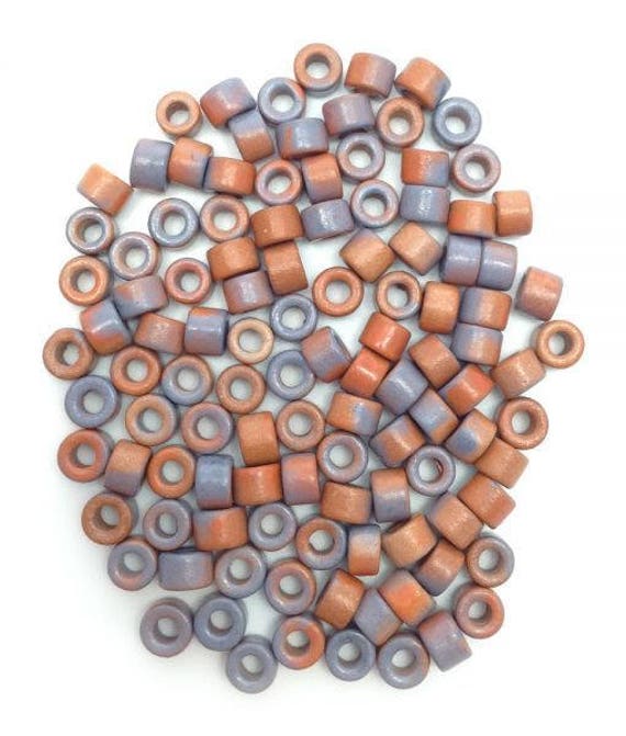 Hundert Keramikperlen in Zylinderform, terracottafarben und flieder gefleckt, 6mm groß.